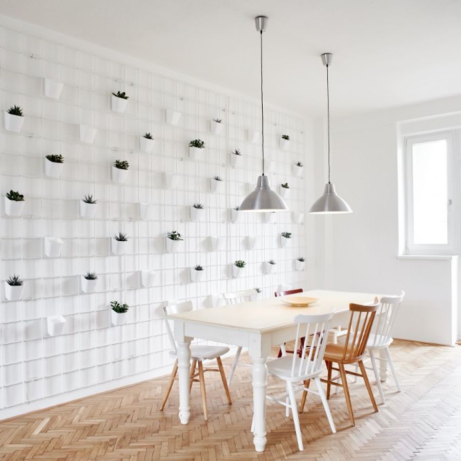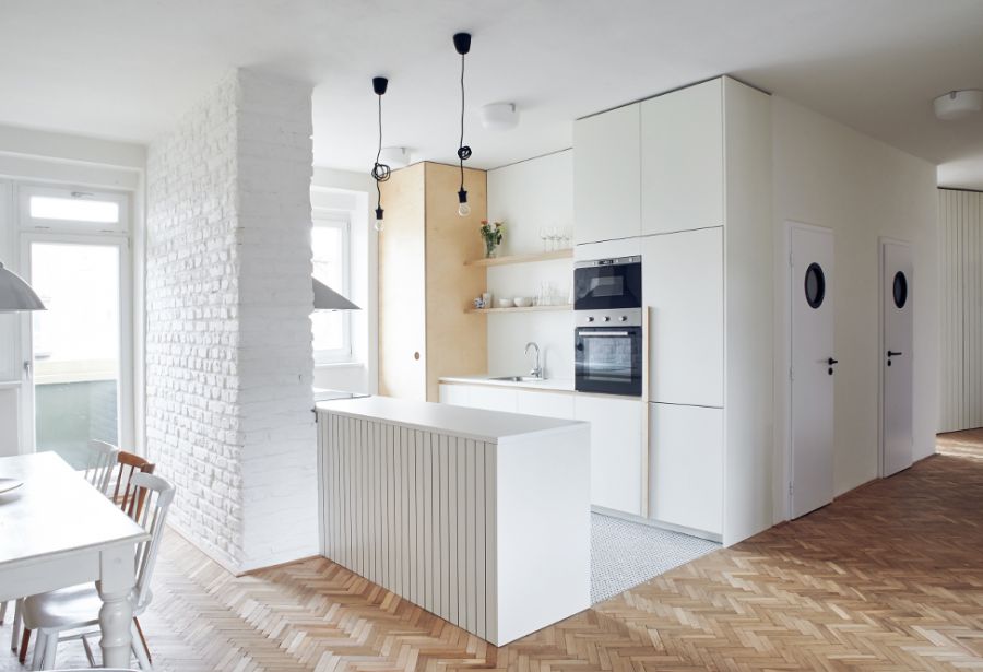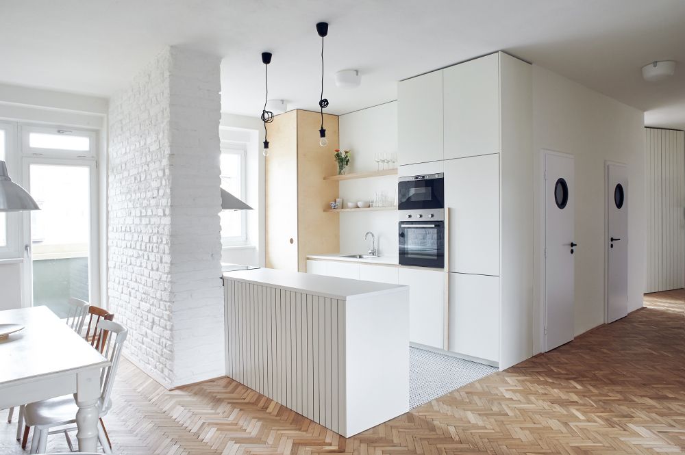 Architekti Martin Machů a Anna Holešovská vytvořili průhledy celým bytem v obou jeho osách. Již od vstupních dveří můžete přehlédnout celkovou délku bytu. Obývací pokoj s jídelnou a kuchyní se rozprostírá přes celou šířku bytu – respektive patra – a umožňuje odsud přístup na oba balkóny.