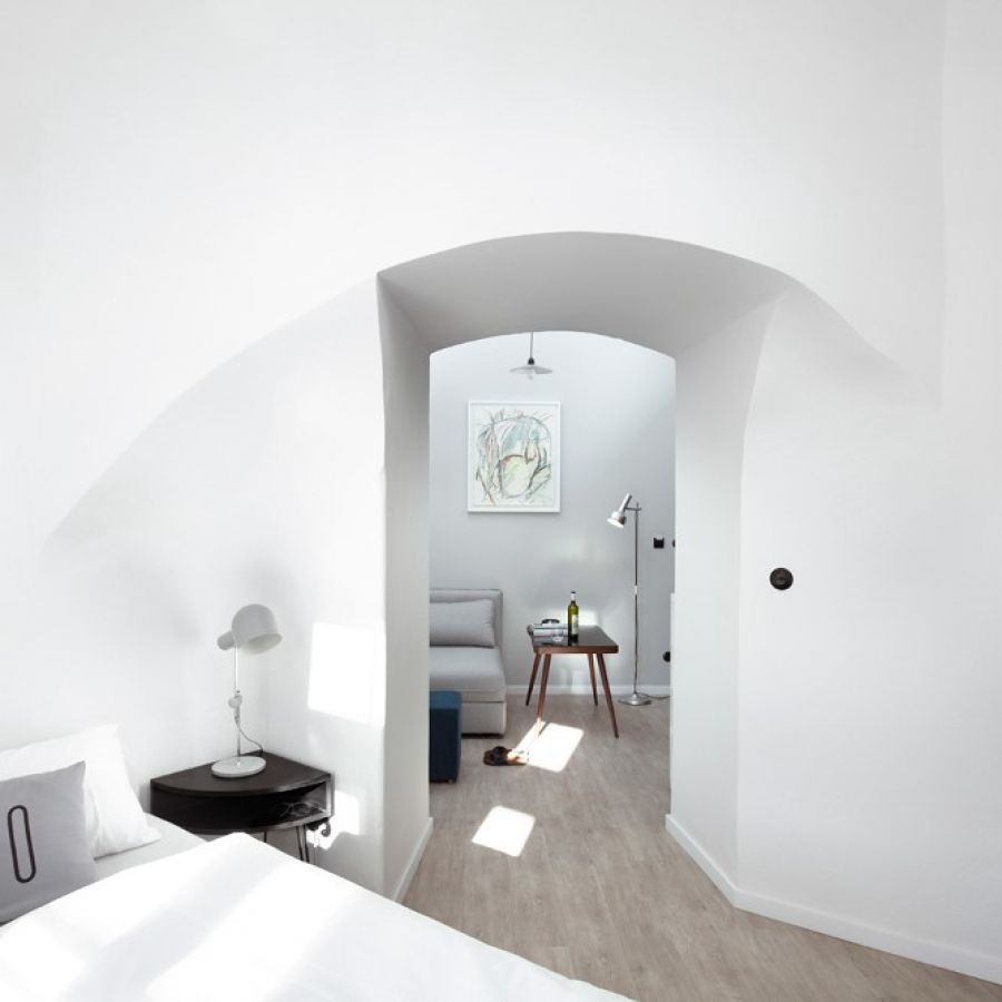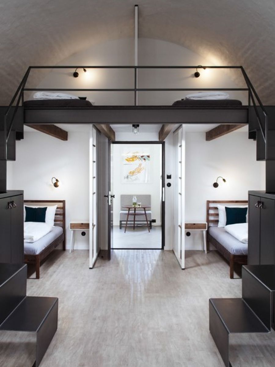 Cílem celkové koncepce hostelu včetně veškerého vybavení a výtvarného řešení bylo podtrhnout historický genius loci a citlivými úpravami ho obohatit o současný design. Organicky zaklenutá chodba, která vede od recepce do všech pokojů je z každého úhlu pohledu jiná a při jejím procházení překvapuje v každém momentě. Její formy ještě zvýrazňuje nenápadná a přesto sofistikovaná práce se světlem, pro kterou se autorka inspirovala ve scénografii. Čistě bílá omítka kontrastuje s černými detaily i citlivým výběrem pastelových barevných odstínů, kterými je čalouněn jednoduše navržený sedací nábytek, seskupený do podoby intimních zón.
