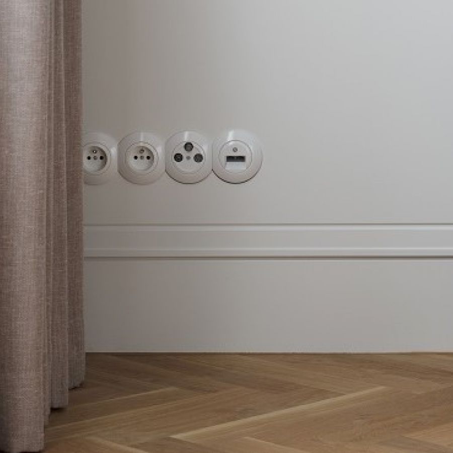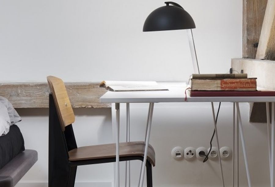 Dobovou atmosféru podtrhuje i výběr vypínačů. Zde padla volba interiérové designérky Denisy Strmiskové na vypínače z řady berker serie 1930 od společnosti Hager. Vypínače serie 1930 se svým vzhledem odvolávají na ty historicky používané. Díky svému retro vzhledu a dvěma možnostem výběru materiálu – porcelánu a bakelitu – jsou oblíbenou volbou architektů do historických budov, ale překvapivě dobře si rozumí i s minimalismem současných designových interiérů. Svítidla i jejich ovládací prvky – vypínače a zásuvky – dodal designový obchod Monobrand.