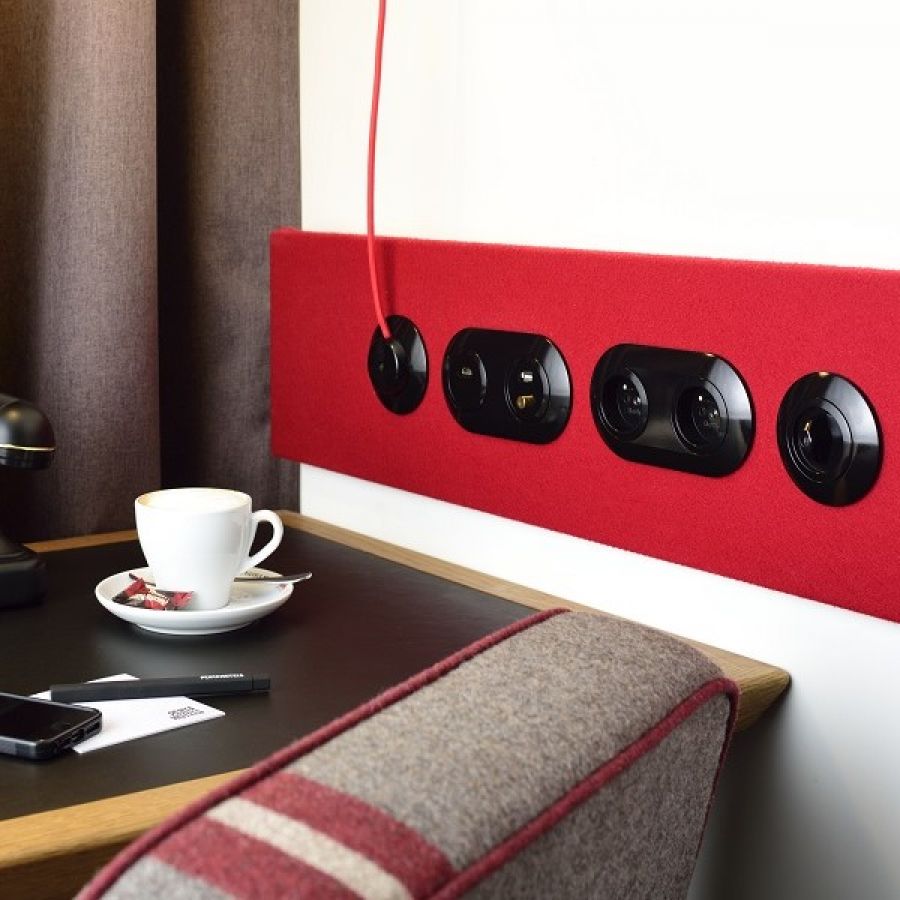 Vybavit stylový hotel v jednom z nejstylovějších měst Evropy…to bylo zadání pro společnost Hager. Skloubit maximální bezpečnost hotelových hostů s pohodlím a designem. Ve společných prostorách hotelu našly uplatnění černé parapetní žlaby pro decentní a elegantní vedení kabelů. Rozváděče se spínacími a jisticími prvky byly důmyslně schované v podhledech a nikterak neruší decentní vzhled pokojů. Retro otočné vypínače berker Serie 1930 v černé barvě jsou naopak šperkem každého interiéru a pokojům v pentě vysloveně sluší. Prostory hotelu jsou vybaveny vypínači a zásuvkami v černém plastu, v pokojích najdete ze stejné série i čtečku na hotelovou kartu nebo multimediální box sestávající z USB a HDMI zásuvky.