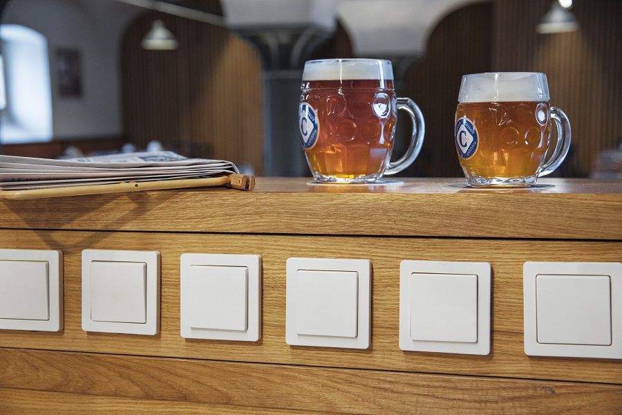 Dobovou atmosféru výrobní části pivovaru akcentují a k měděným varnám skvěle ladí porcelánové otočné vypínače berker Serie 1930 Porzellan Made by Rosenthal, zatímco v restauraci našly uplatnění klasické čtvercové vypínače Q.1 se svou nevtíravou krásou a sametovým povrchem.