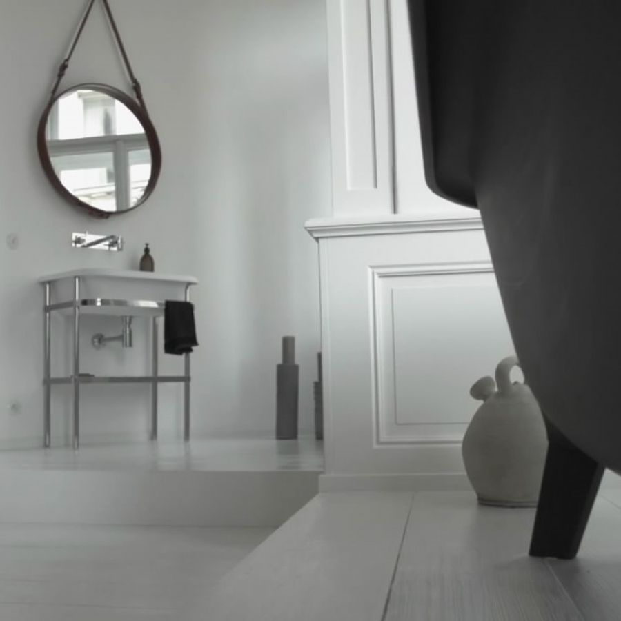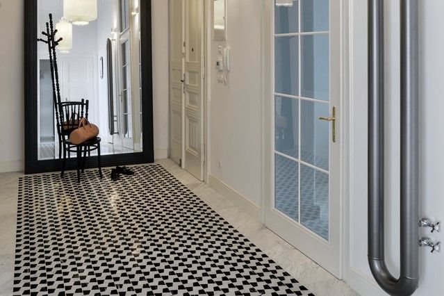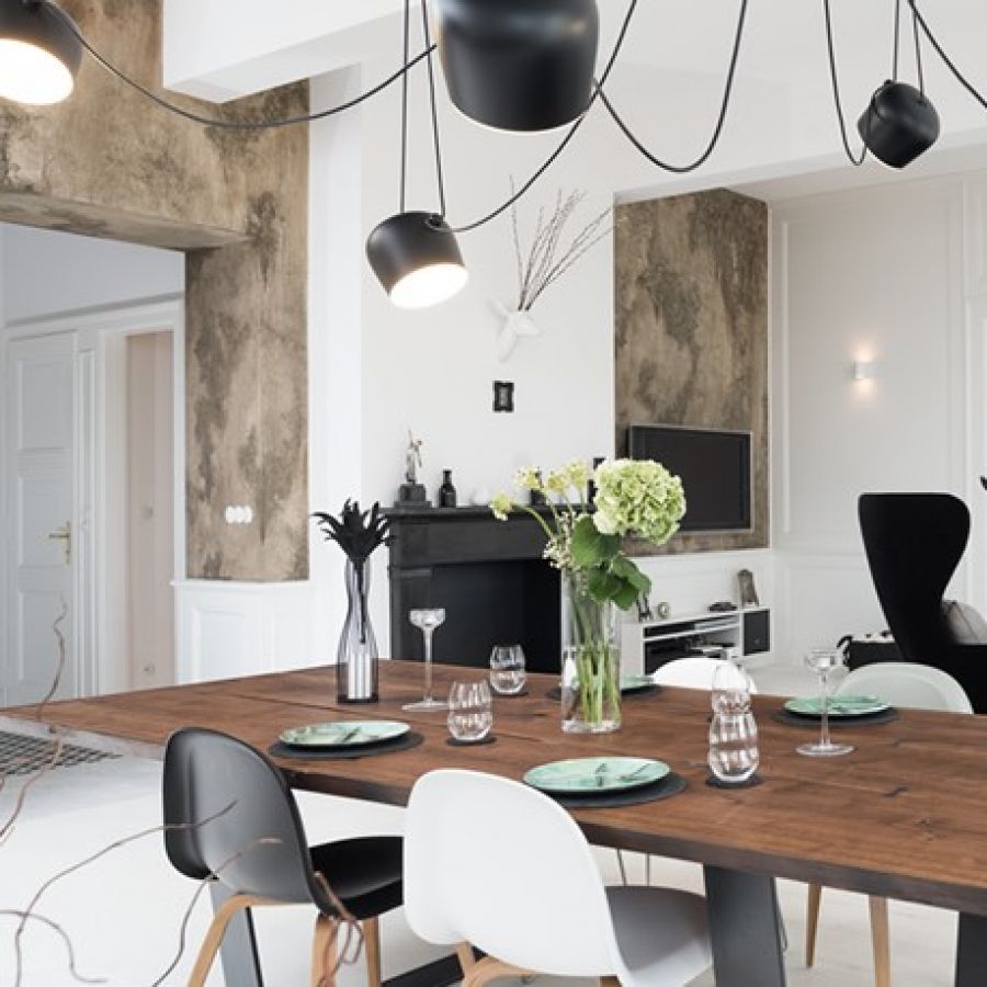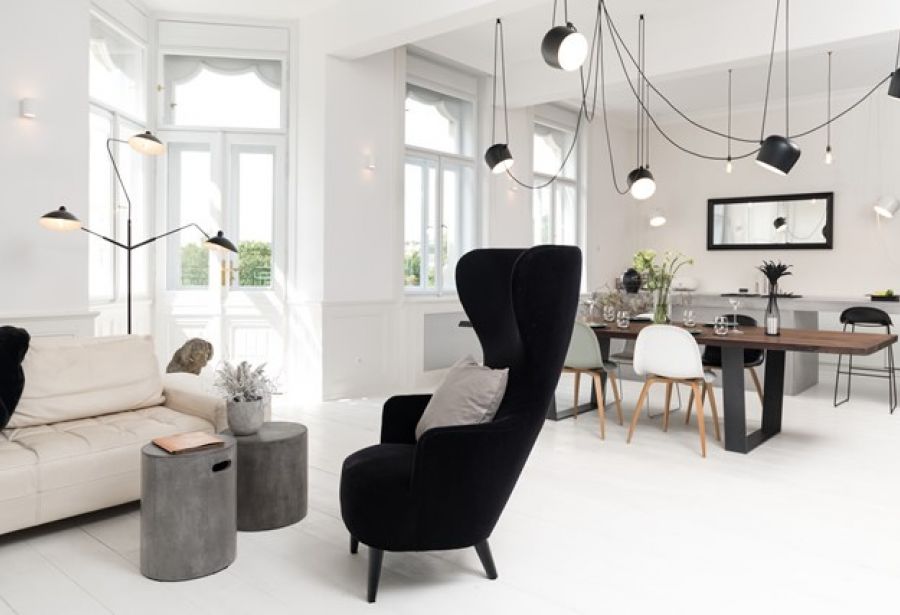 „I přesto, že se v bytě původních prvků moc nedochovalo, rozhodli jsme se většinu stavebních prvků obnovit a doplnit. Celý interiér je laděn do bílé. Kontrastní plochou je výrazná výmalba stěny v obývacím pokoji a vstupní hale. Původním záměrem byla oškrábaná omítka, které nebylo možné kvůli novým rozvodů elektro dosáhnout. Nicméně myšlenku „plesnivé zdi“ jsme se rozhodli neopustit a po několika desítkách vzorků padla volba na malbu kulis,“ říká Radka Valová.